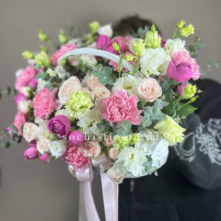 Состав корзин в Тамбове определяется текущими поставками и сезоном. Розы Freedom, Mondial, Cappuccino — для классических куполообразных аранжировок. Пионы в мае-июне из свежих поставок: Sarah Bernhardt, Red Charm, Bowl of Cream — главный сезонный продукт. Хризантема, альстромерия, гербера — для объёмных торжественных наполнений. Эустома, ранункули — для садовых корзин. Флорист строит состав под конкретный запрос.