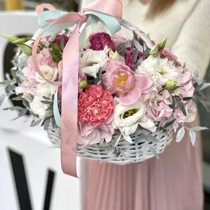 Каждый сезон приносит в Тамбове свой ассортимент корзин. Весной флорист создаёт корзины с тюльпанами и нарциссами — лёгкие, нежные, полные ощущения обновления. В мае-июне приходят пионы — Sarah Bernhardt, Bowl of Cream, Red Charm — главный флористический праздник. Осенью — хризантема в тёплых гаммах с декоративными ягодами и ветвями. Зимой — хвойные аранжировки с амариллисом для праздничной атмосферы.
