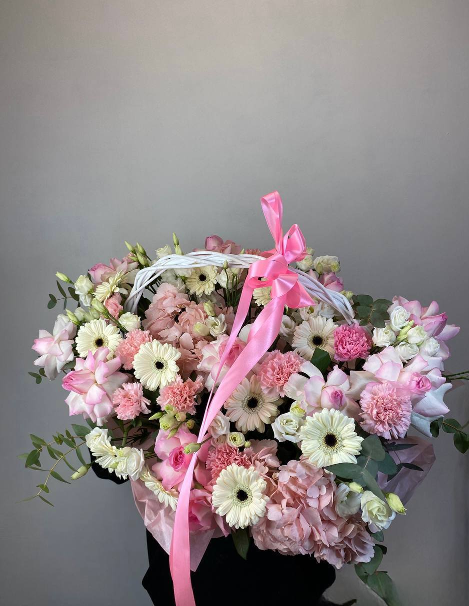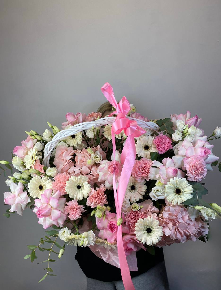 Солнечная мимоза встречается с тюльпанами и пионовидными розами Мисти Бабблс. Весенняя палитра собрана в корзине, где каждый цветок занимает свое место в общем ритме.