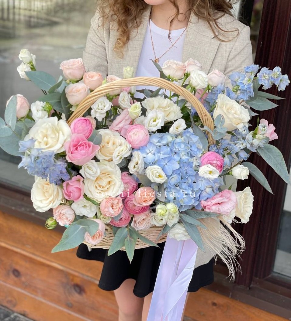 роза одноголовая, роза пионовидная, альстромерия, эустома, гортензия, ковыль, диантус, плетеная корзина.