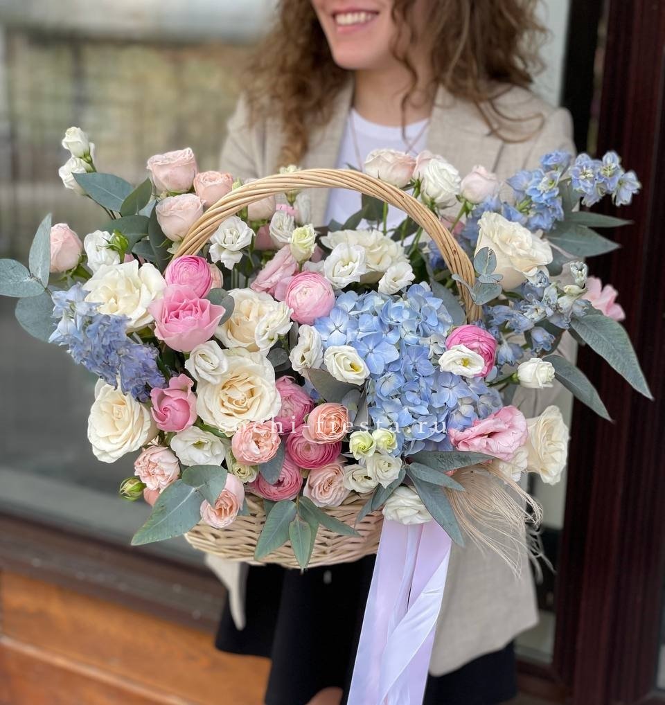 Корзина объединяет садовые розы с воздушной эустомой и яркими вспышками альстромерии. Ковыль добавляет лёгкости, а гортензия создаёт фактурный фон для всей композиции.