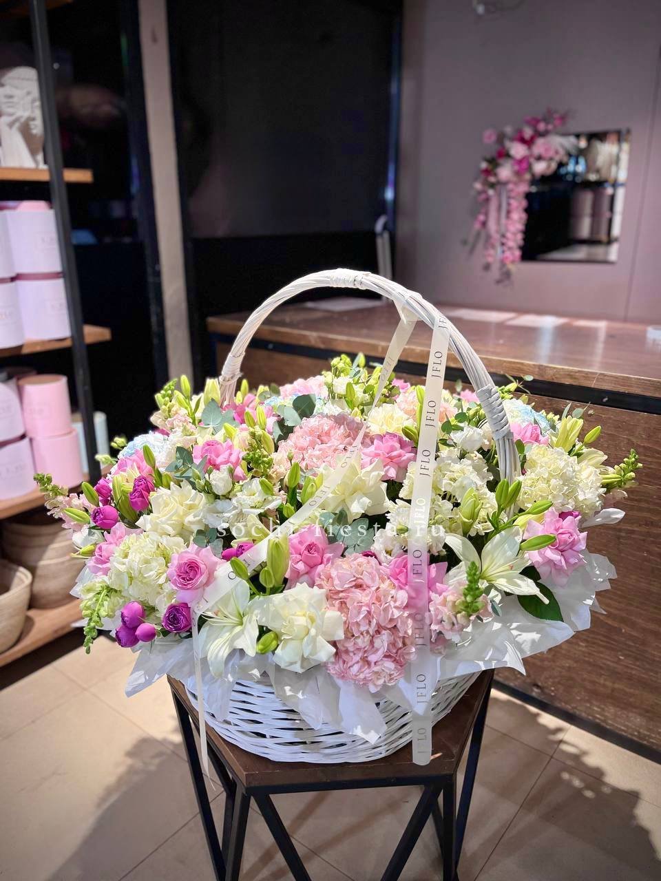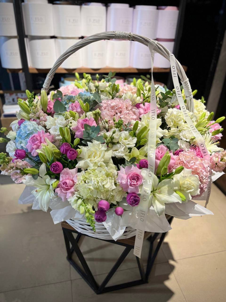 Масштабная корзина объединяет лилии, гортензии, антиринум, розы и эустому в единую объёмную композицию. Высота и насыщенность каждого слоя создают впечатление цветочного изобилия.