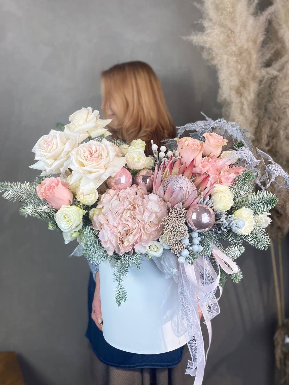 Высокая композиция с протеей и пионовидными розами среди хвойной зелени напоминает зимний сад. Бруния и хамелациум добавляют графичности, а ёлочные украшения превращают цилиндр в готовый акцент интерьера.