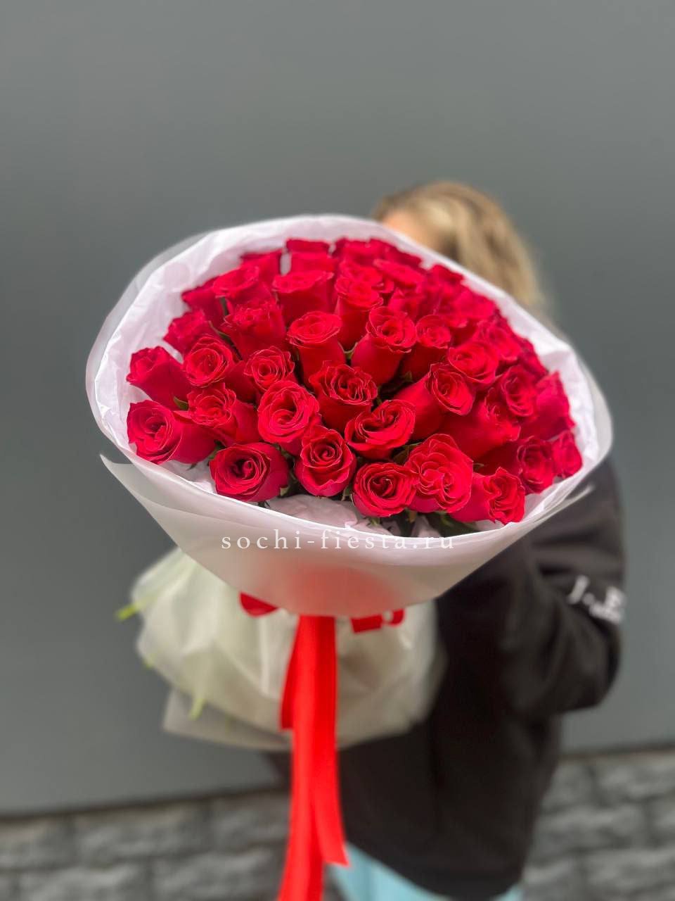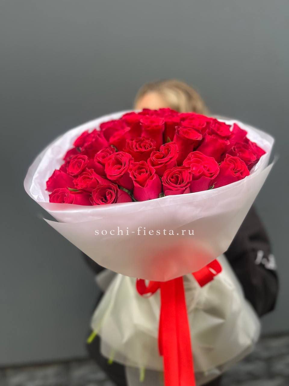 Сто один бутон насыщенного алого оттенка собраны в плотную охапку. Классика жанра в масштабном исполнении для тех моментов, когда слова не нужны.