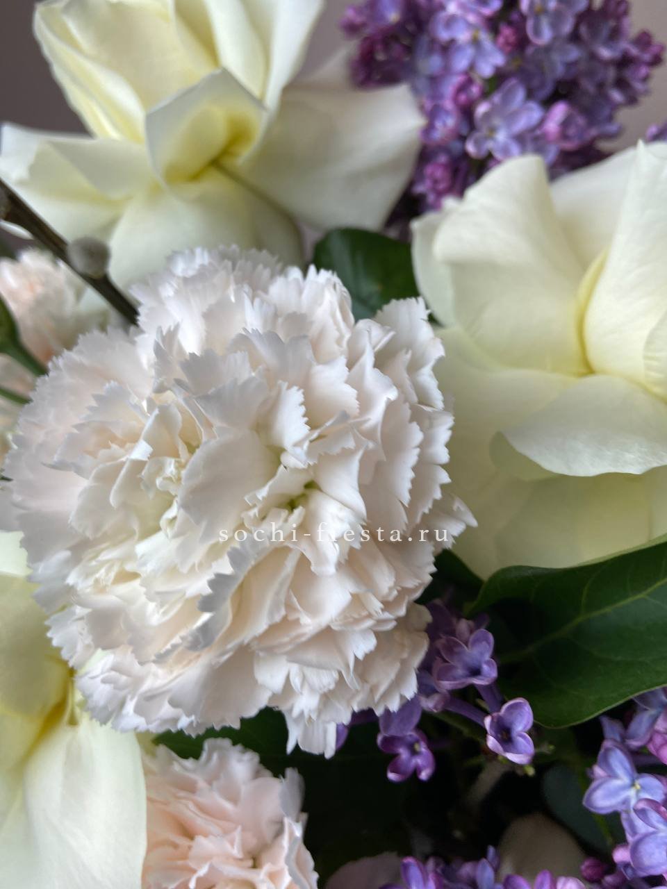 цветочная композиция идеальна для Православных Праздников! Состав выполнен из белых роз, вербы, сирени, диантусов