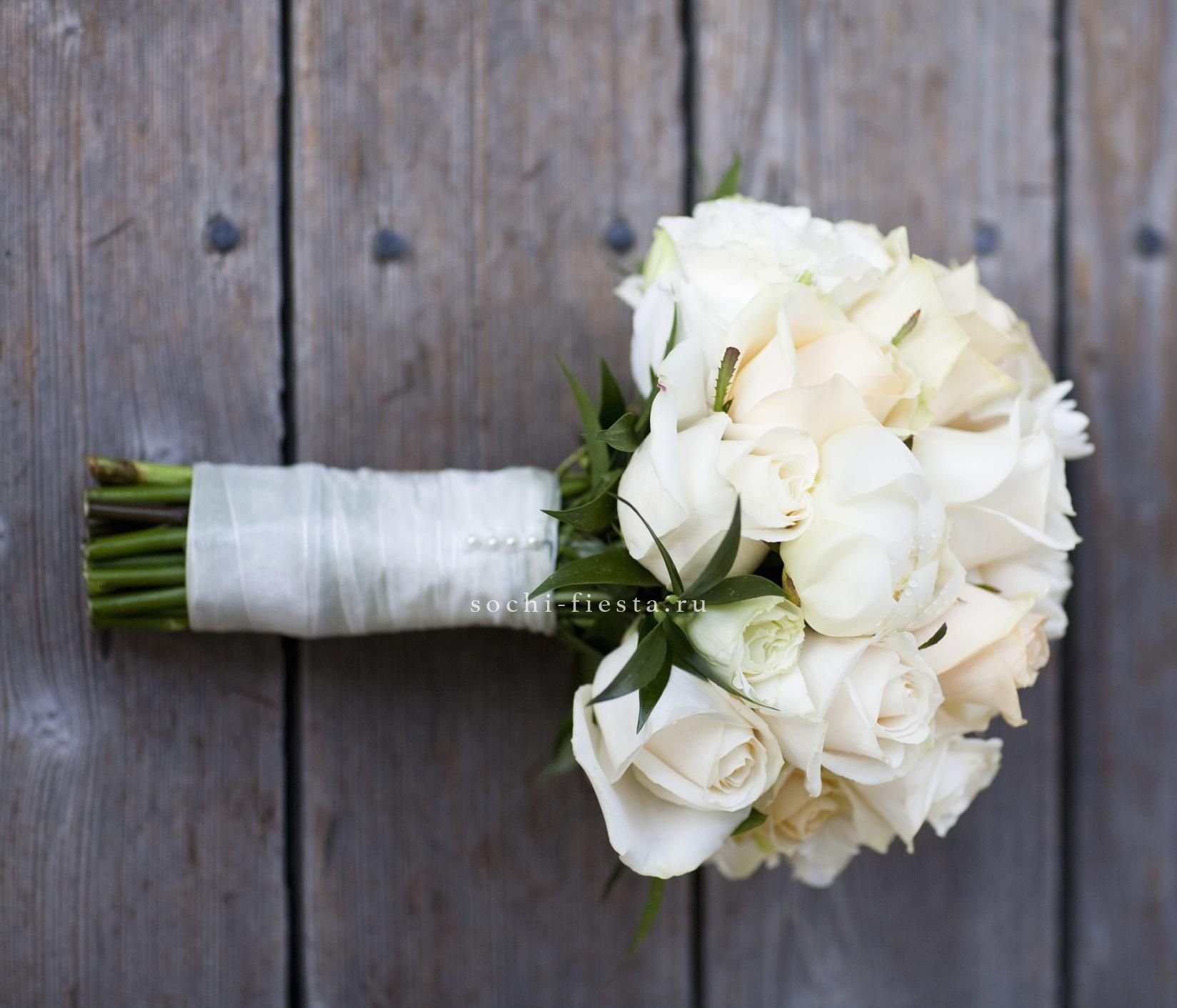 Белоснежная композиция с махровыми соцветиями эустомы и классическими розами. Сезонные детали и зелень образуют естественный рисунок без лишней строгости.