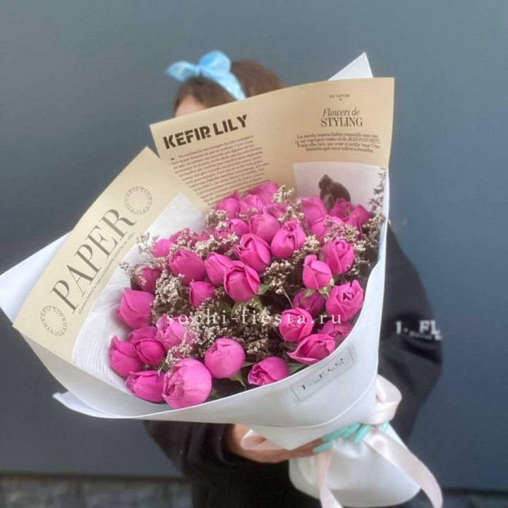 Заказ оформляется на сайте, в Телеграм-канале или по телефону. Моно-букеты 25 и 51 роза всегда в наличии. Специфические сорта, длинные стебли, пионовидные — предзаказ за 2-3 дня.