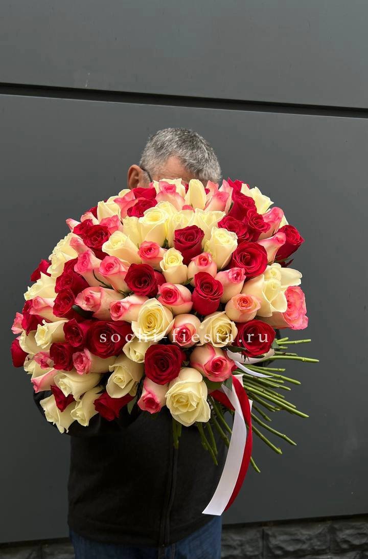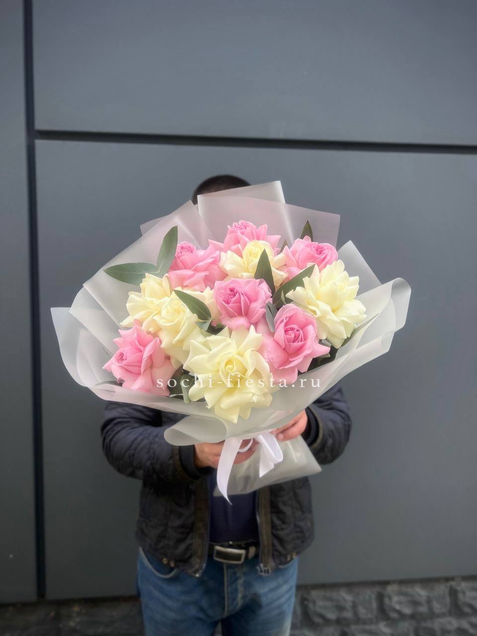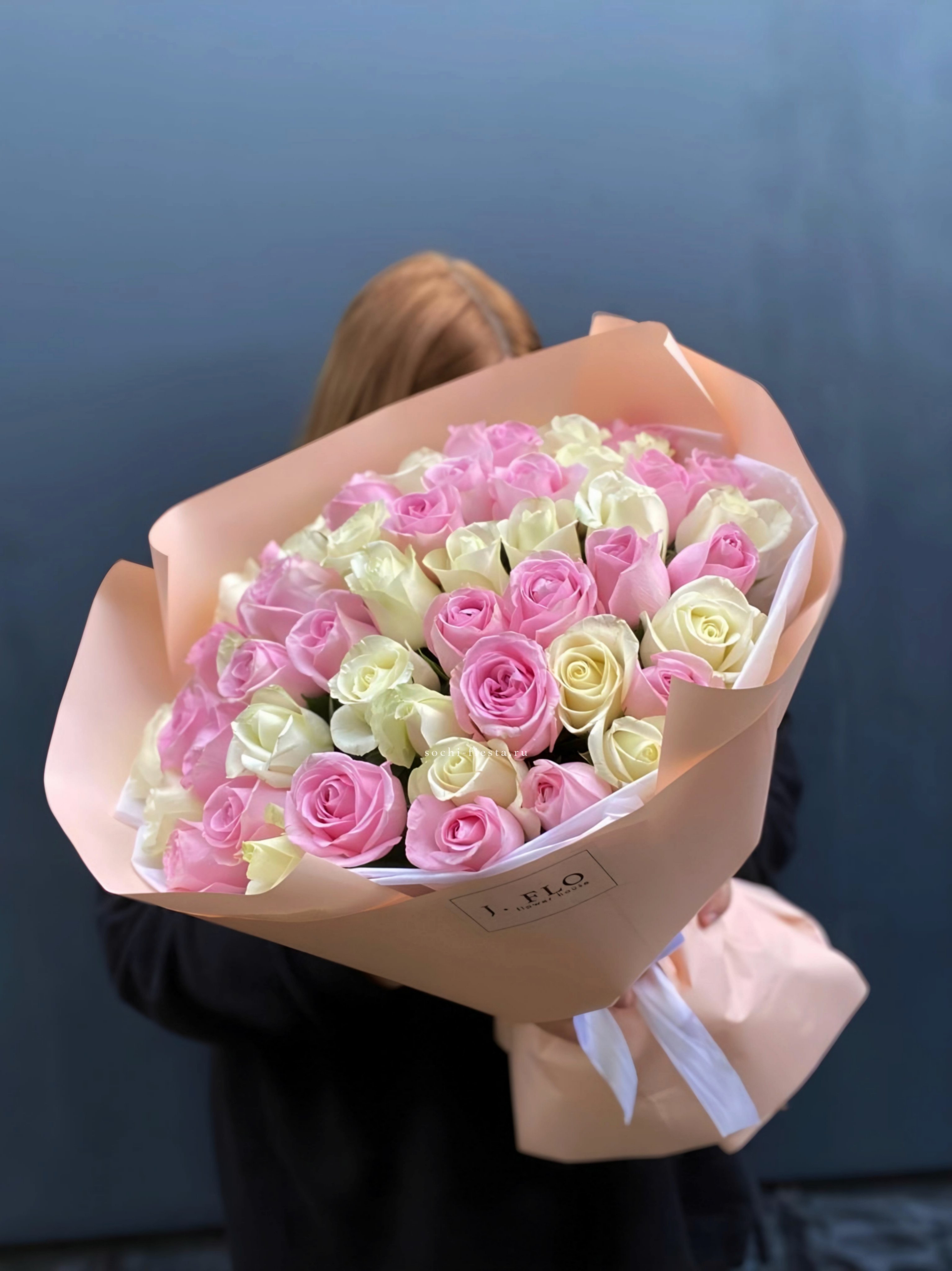 55 роз белого и розового оттенков или же с добавлением кремовой розы, лента, упаковка.