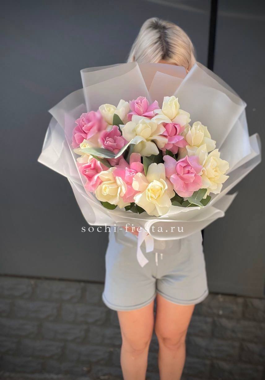 Пятьдесят пять роз переплетают белый и розовый в мягкую градацию без четких границ. Букет дышит светом и воздухом, а его объем позволяет рассмотреть каждый бутон отдельно.