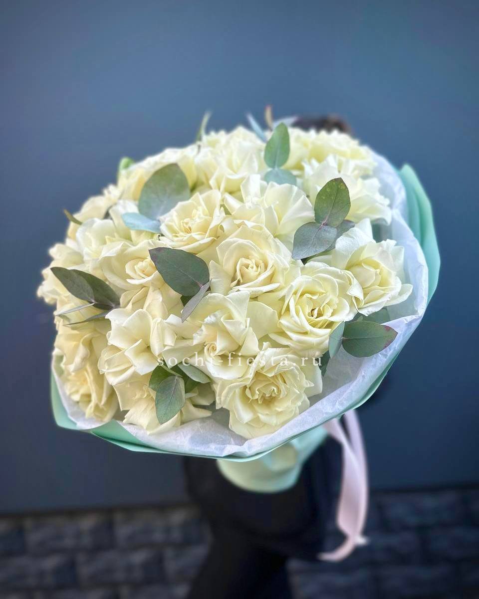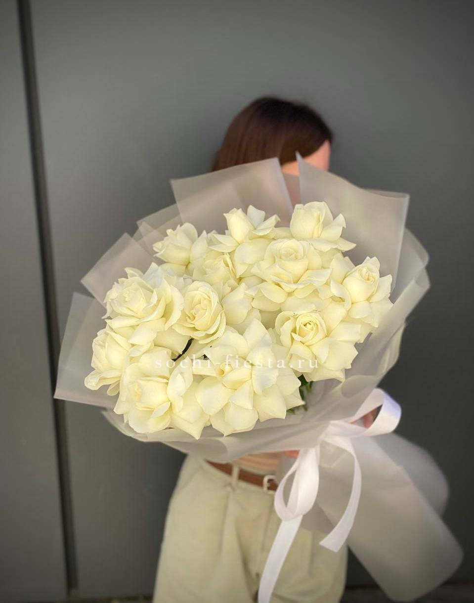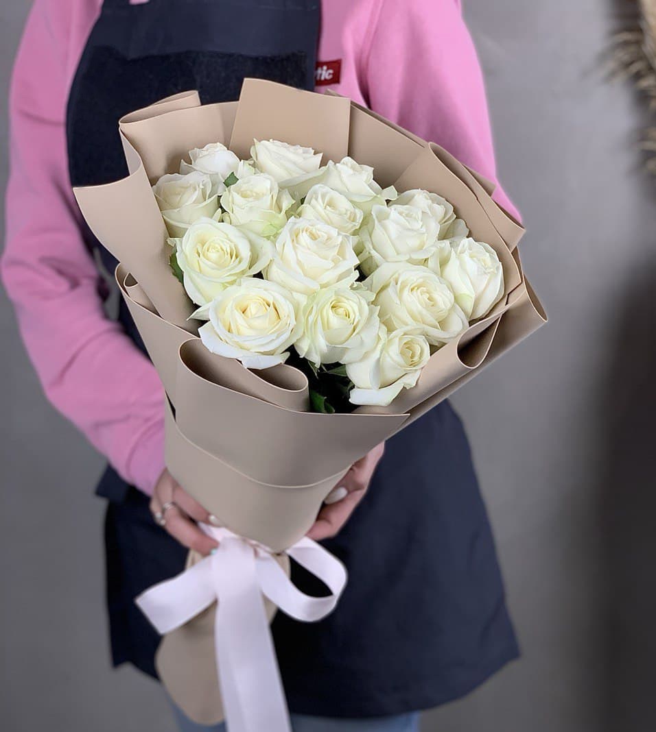 Тринадцать белоснежных бутонов собраны в компактную форму с ровным силуэтом. Букет легко размещается в вазе и сохраняет свежесть долгое время благодаря плотным лепесткам.