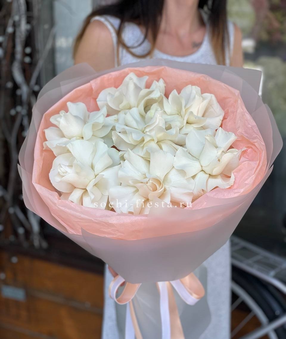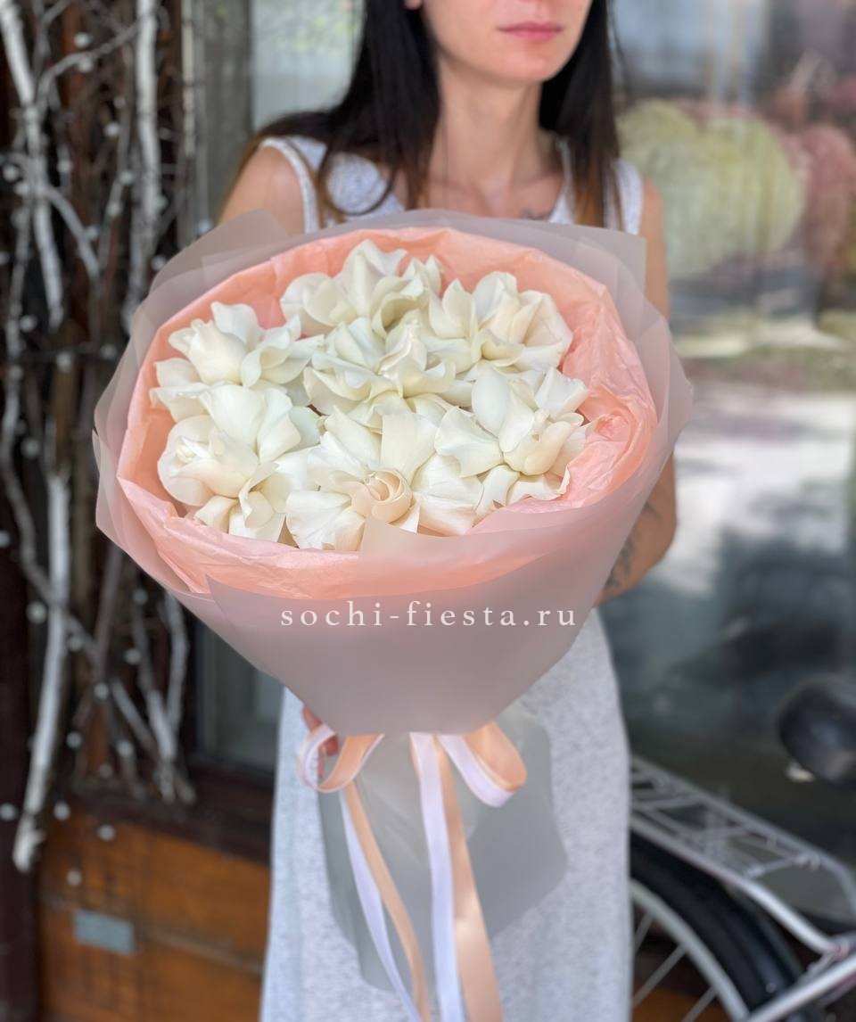 Тридцать пять белых бутонов образуют плотный монохромный ансамбль. Классическая форма и чистота оттенка позволяют букету звучать самодостаточно в любом интерьере.