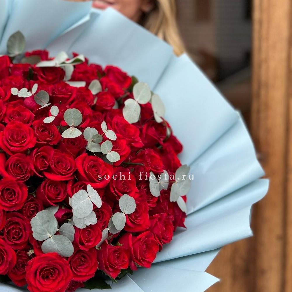 Сто один красный бутон дополнен ветками эвкалипта с серебристой листвой. Объёмная композиция занимает пространство и притягивает внимание своей масштабностью.