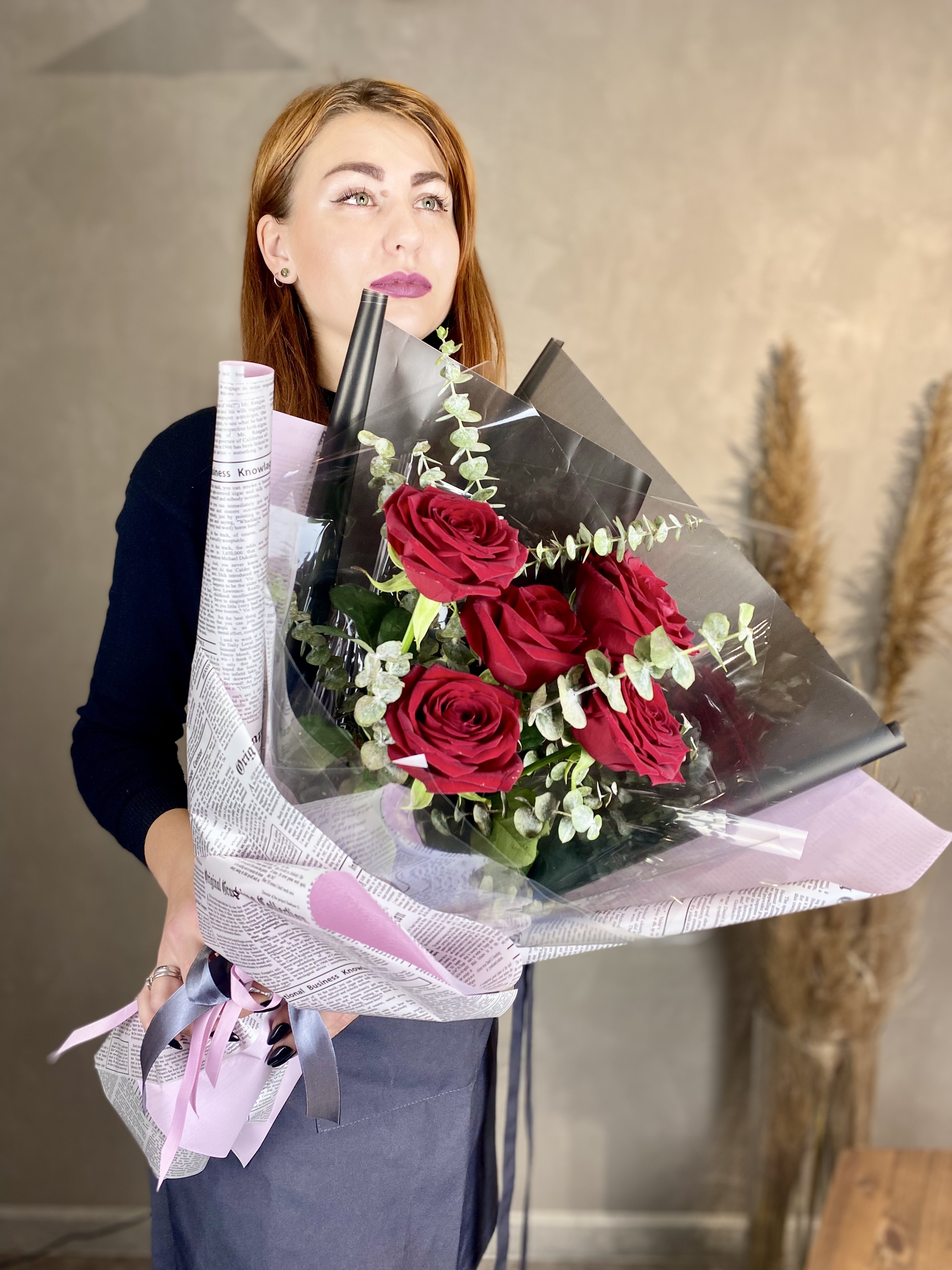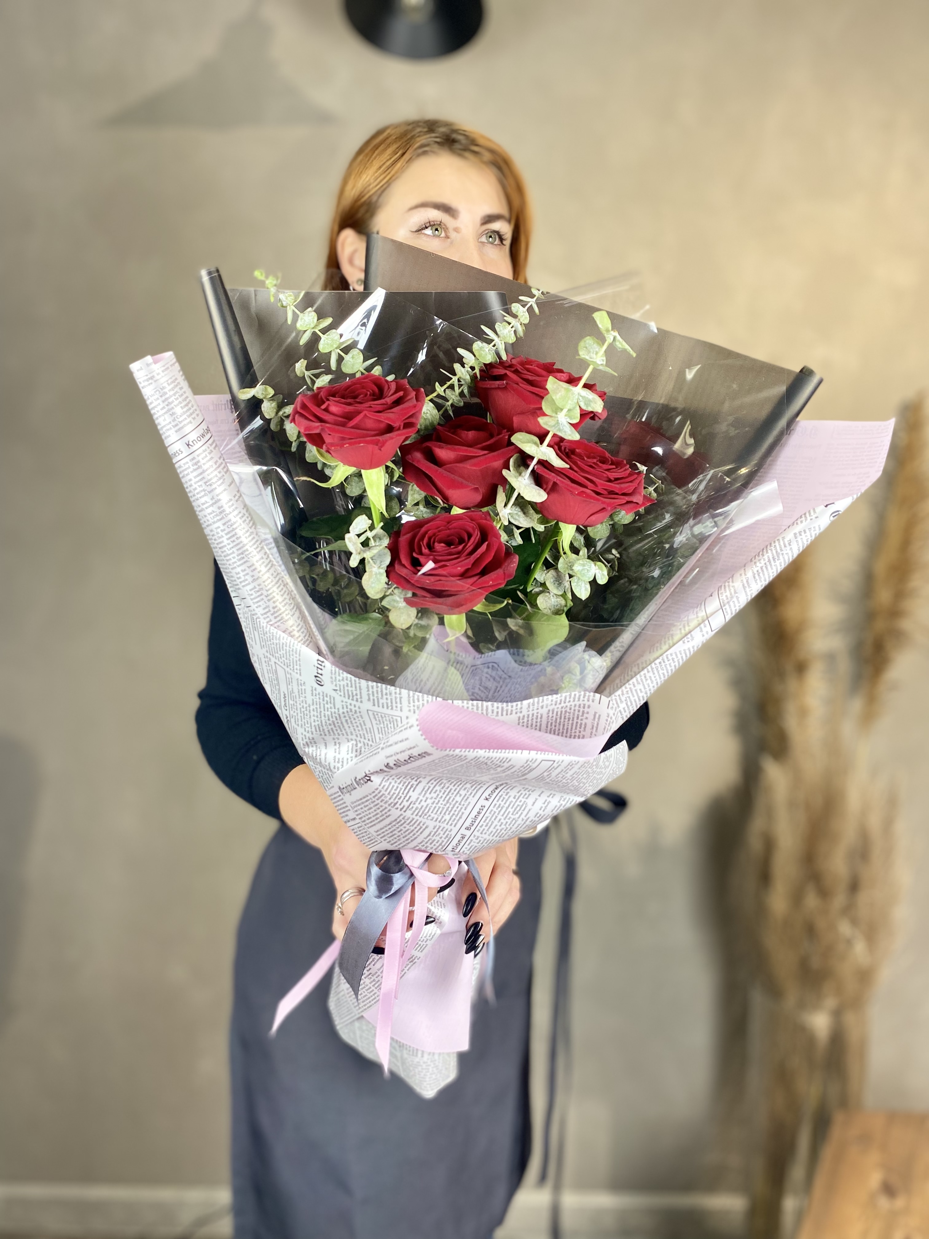 Компактный букет из семи роз с ровными стеблями и аккуратной формой. Эвкалипт создает легкий объем вокруг бутонов, сохраняя четкость линий.