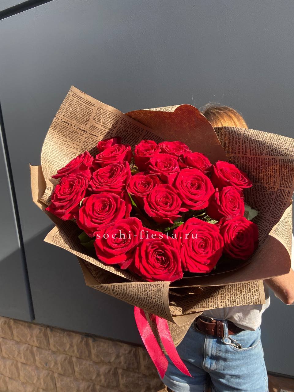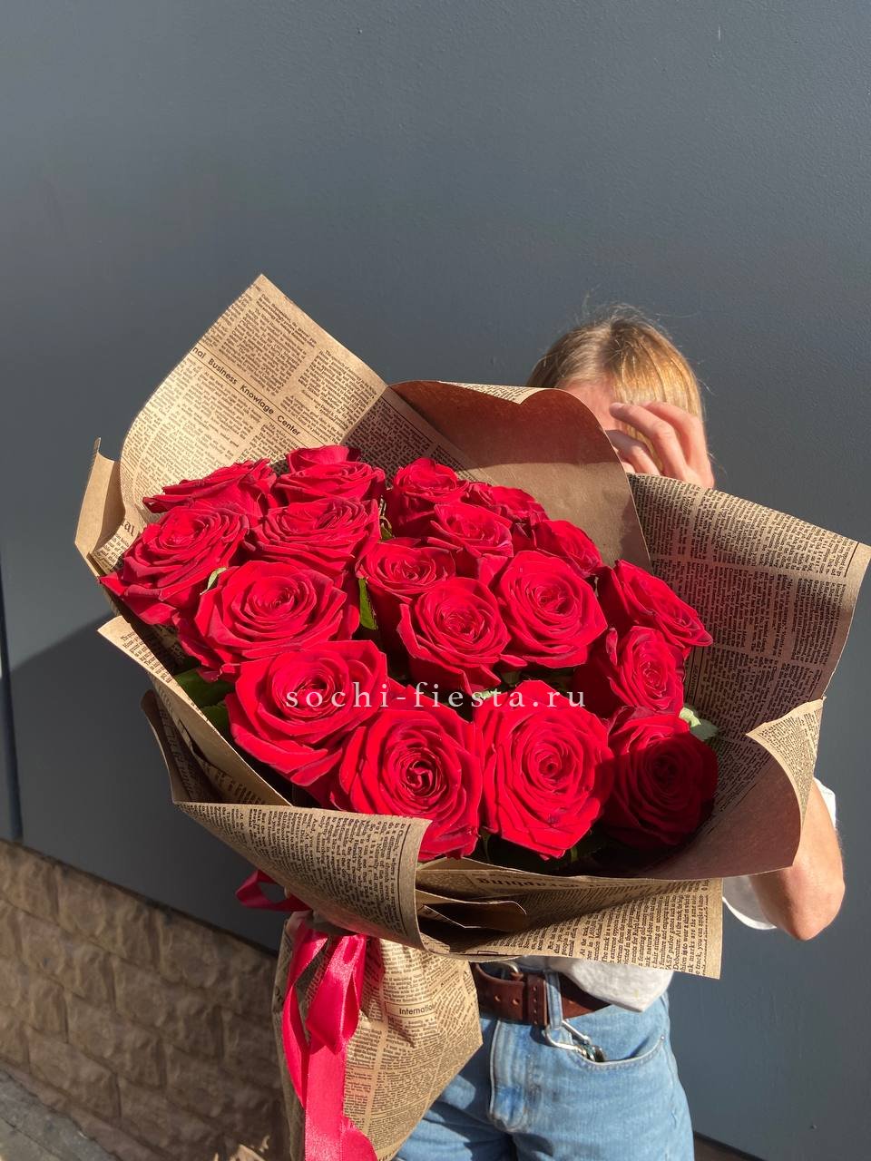 Девятнадцать роз с бархатными красными лепестками в лаконичной крафтовой упаковке. Естественная подача сохраняет свежесть линий и позволяет бутонам раскрыться в полную силу. Классика, которая работает всегда.