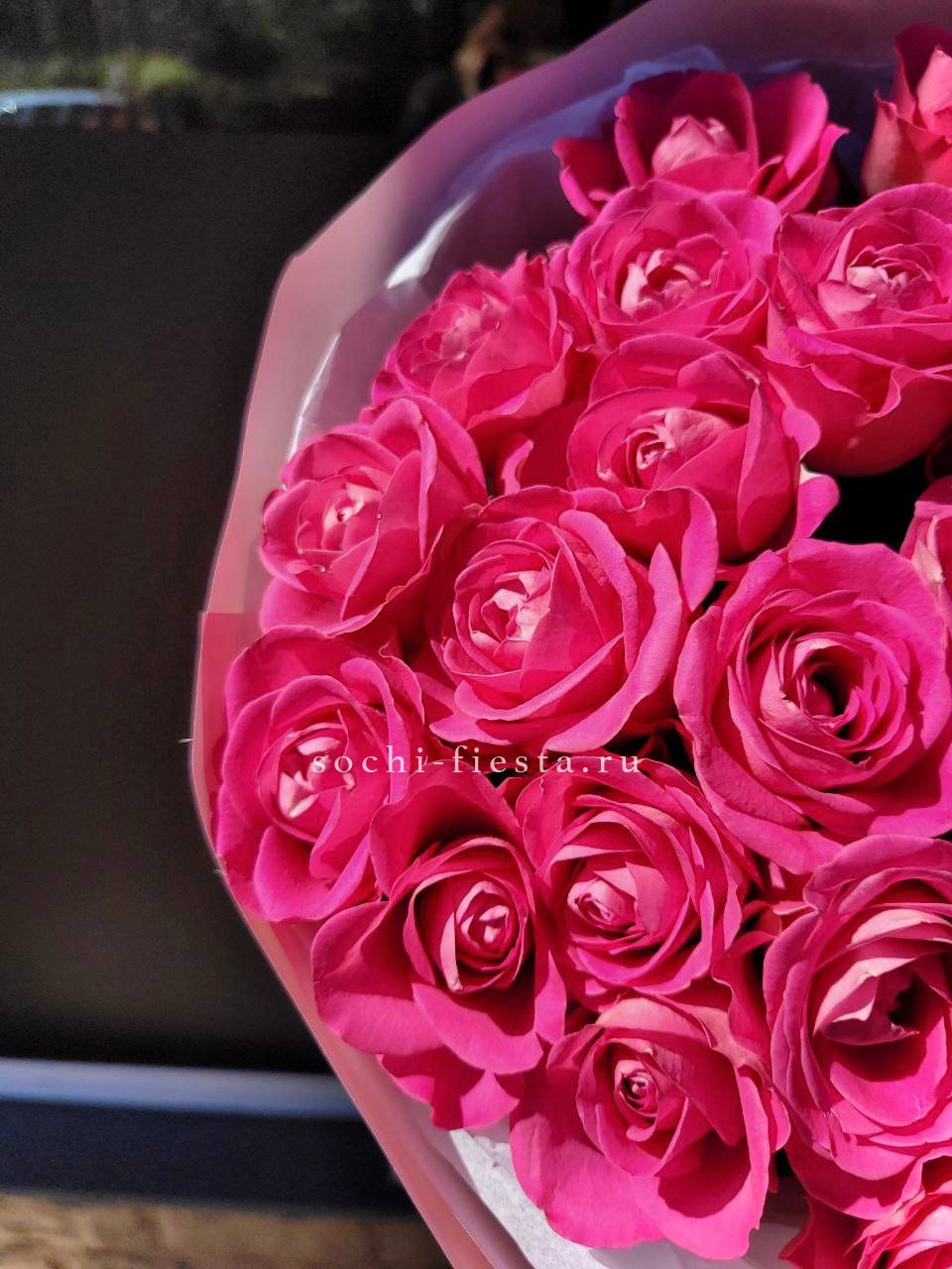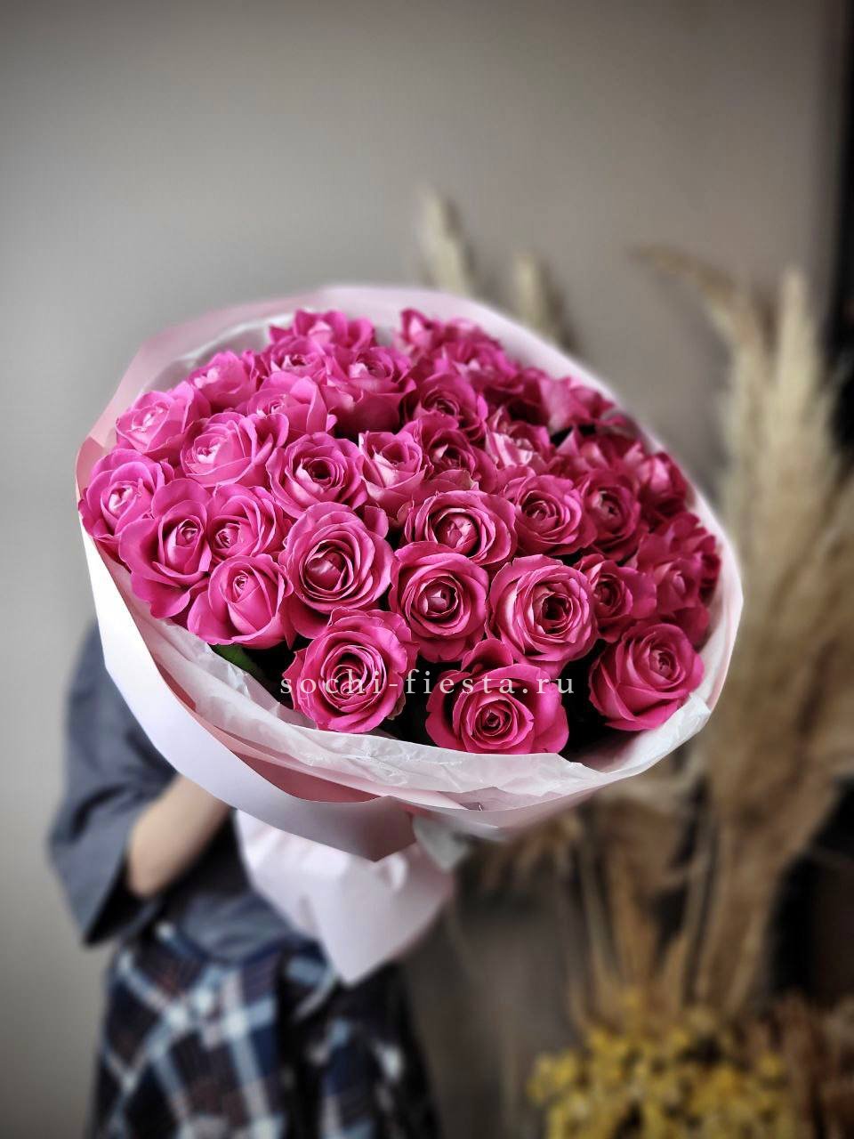 Пятьдесят один бутон формирует роскошную композицию насыщенного розового цвета. Авторское оформление придает букету завершенность. Такой масштаб производит яркое впечатление с первого взгляда.