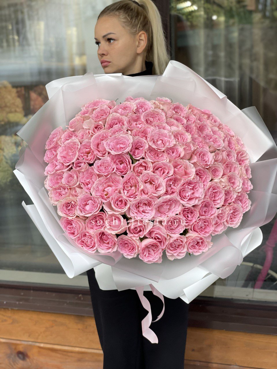 Пятьдесят один бутон с двухцветным переходом от белого края к розовой середине. Пионовидная форма создаёт пышную текстуру и глубину. Лента фиксирует композицию без лишних деталей.