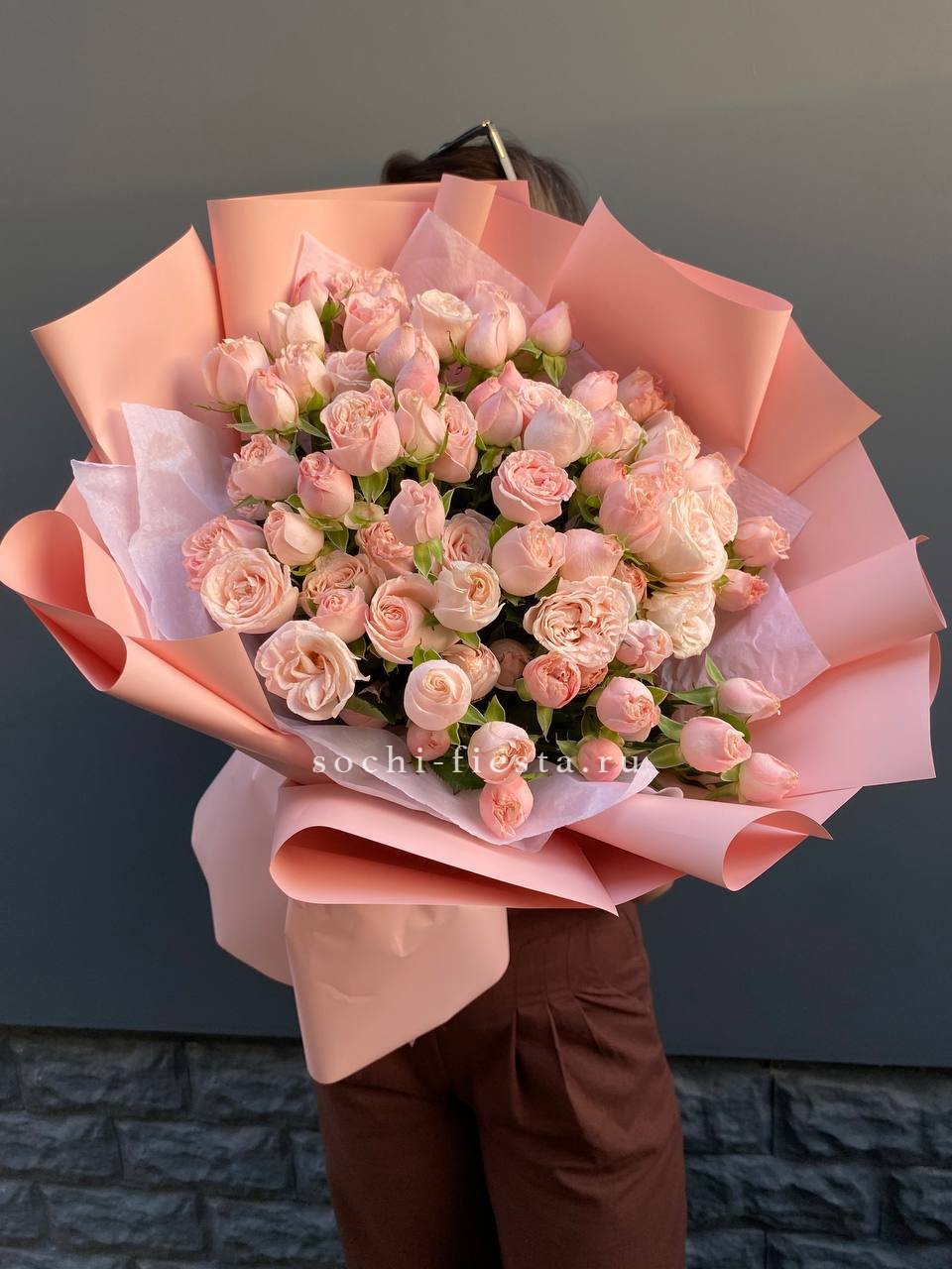 Тридцать пять пионовидных кустовых роз формируют объёмную композицию с густой текстурой. Плотно уложенные бутоны создают впечатление цветочного облака в дизайнерской упаковке.