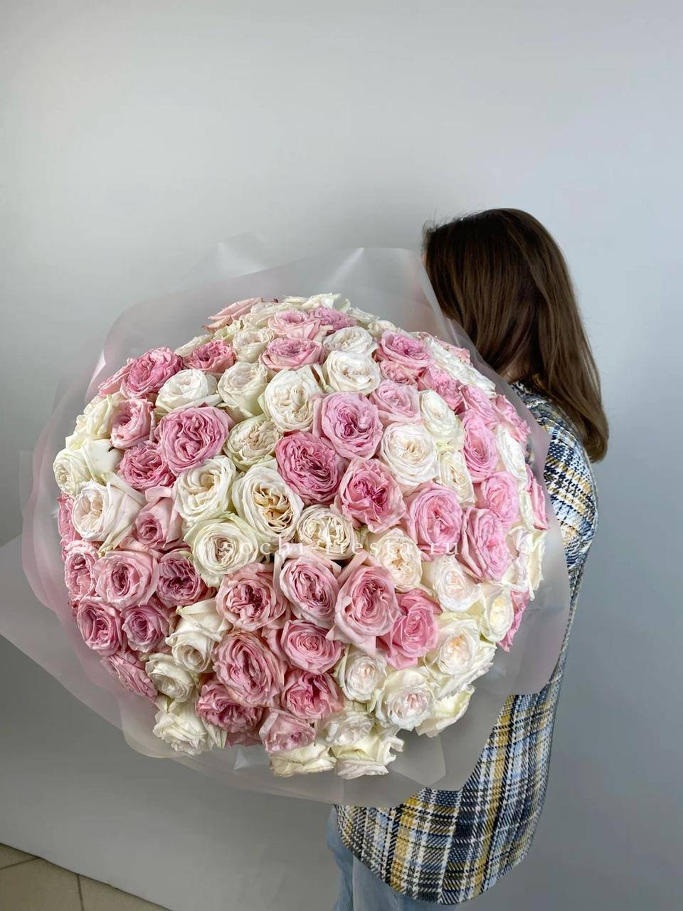 Семьдесят пять роз O'Hara формируют объемную композицию с плотно набитыми бутонами. Классическая подача под ленту сохраняет чистоту формы и выразительность каждого цветка.