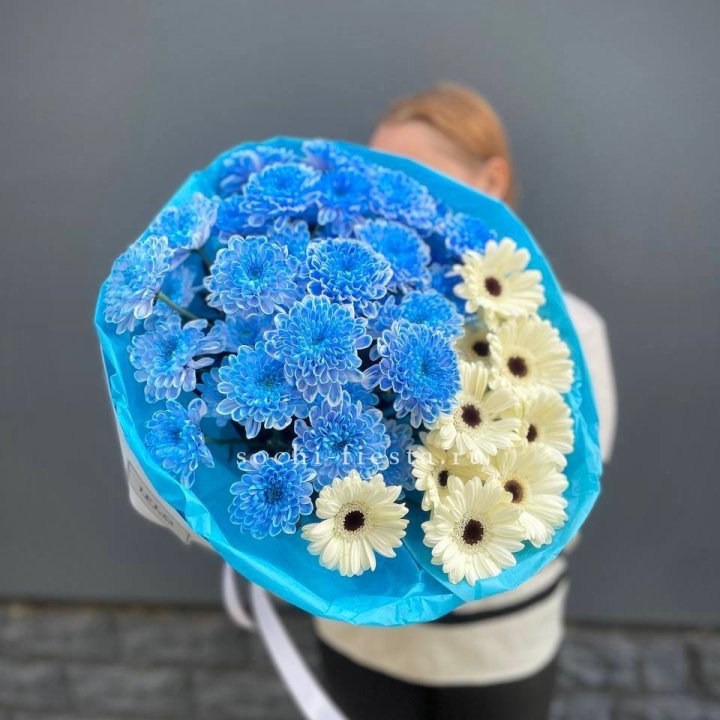 - День рождения — объёмный букет, розы с хризантемой и фрезией.