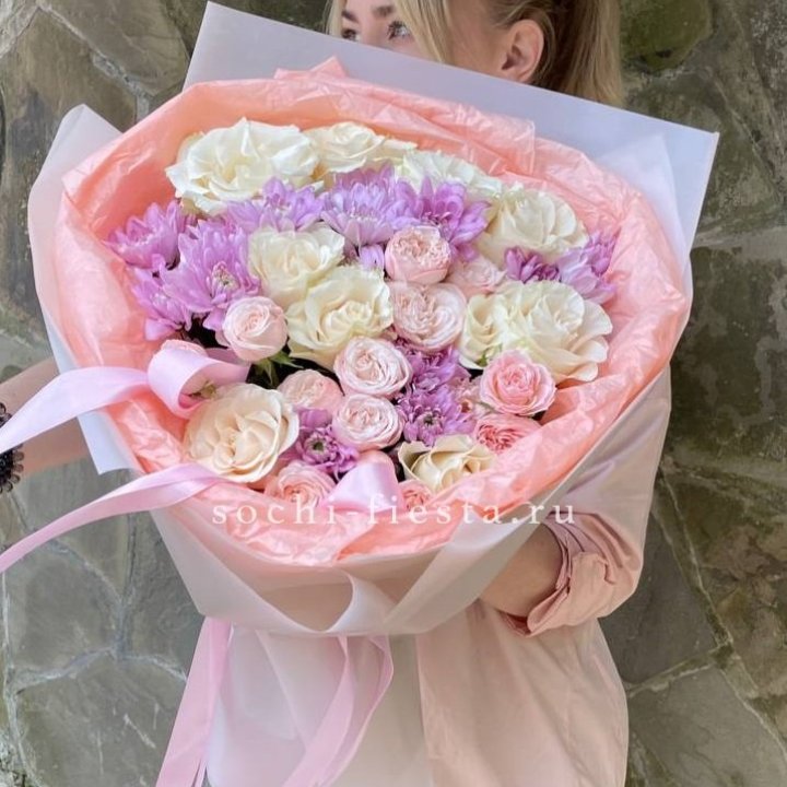 Зима и лето в Тамбове — розы и хризантемы как основа. Эти виды стабильны в поставках круглый год. Флорист дополняет их сезонными акцентами: хвойные ветви зимой, открытая эустома летом. Сборный букет в любое время года выглядит живым и актуальным.