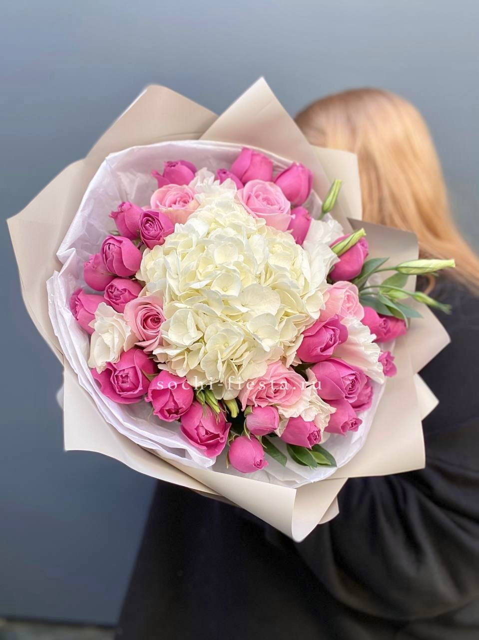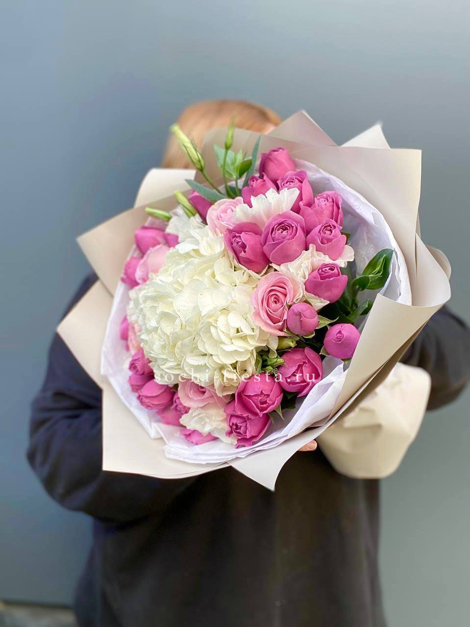 гортензия, эустома, кустовая роза, диантус, лента, упаковка Состав букета в несозон может нести незначительные изменения.