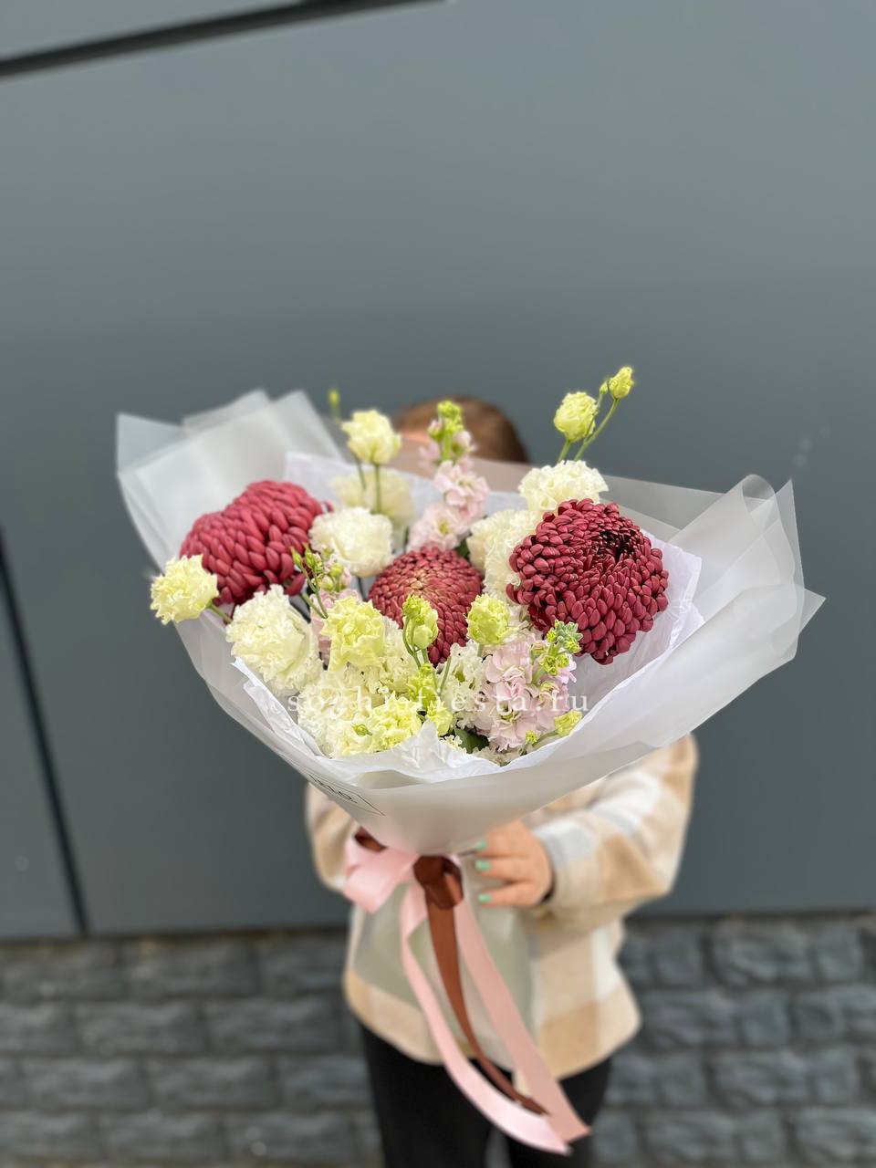 Маттиола наполняет букет весенним ароматом и текстурой вытянутых соцветий. Кудрявая хризантемия Бигуди и многослойная эустома создают объём и лёгкость, которая освежает пространство.