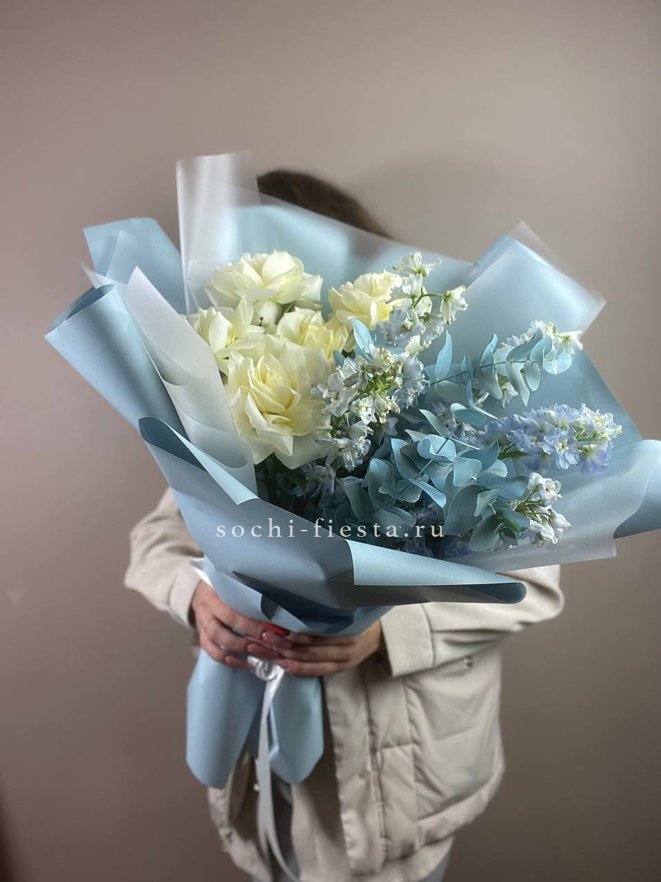 вывернутые розы, дельфиниум, эвкалипт, лента, авторская упаковка.