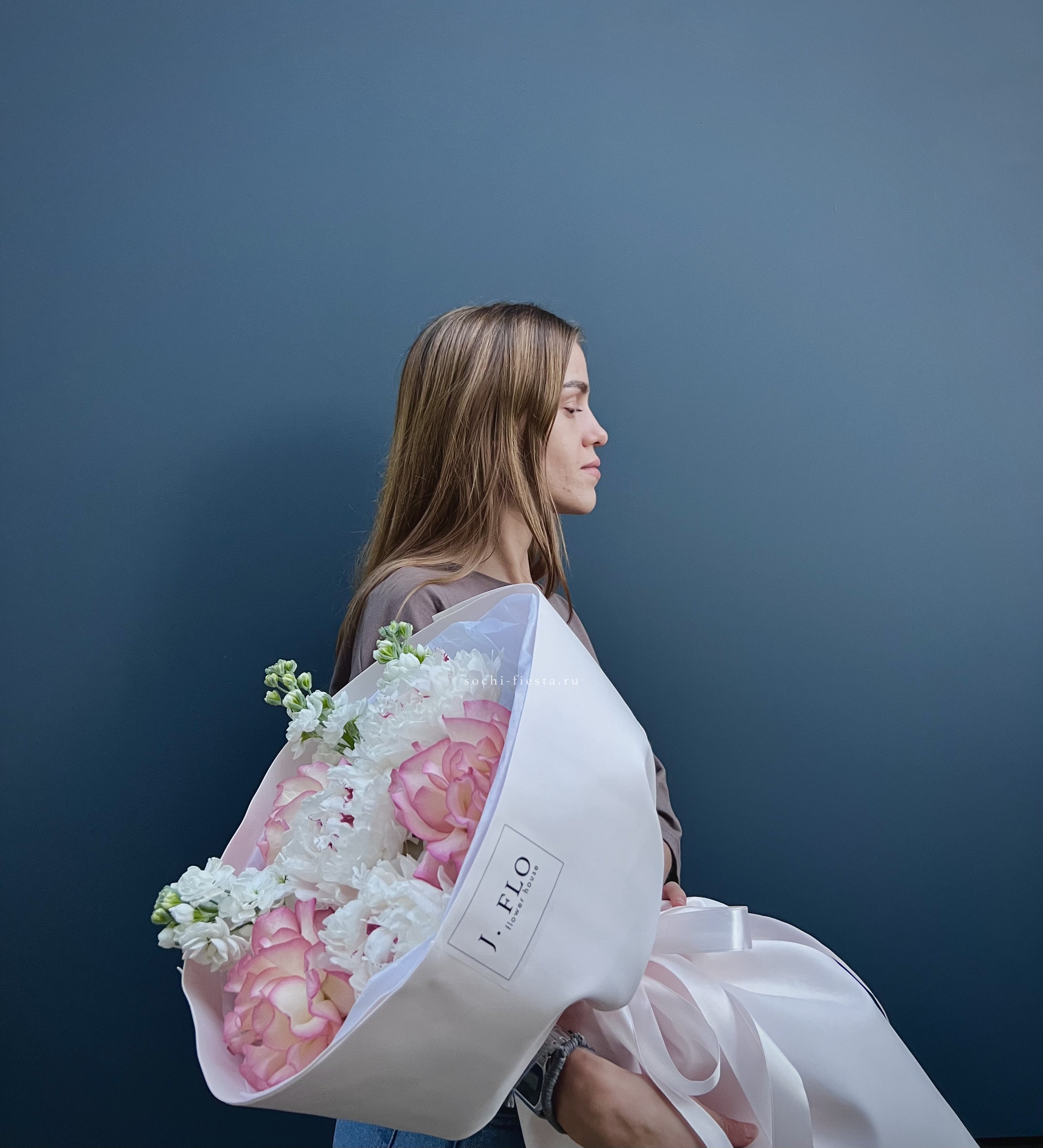 Пионы раскрываются пышными шапками, розы добавляют структуру, а маттиола наполняет букет вертикальными линиями. Тишью и пленка создают лаконичную обёртку, не перебивая природную красоту. Композиция выглядит свежо и объёмно.