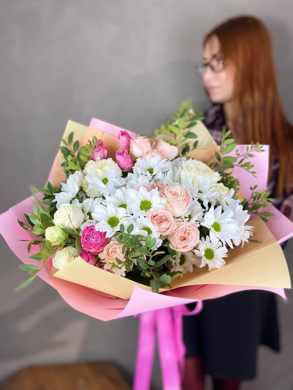 Французские розы и кустовые хризантемы собраны в букет с плотной текстурой и мягким переходом оттенков. Композиция держит форму и долго сохраняет свежесть.