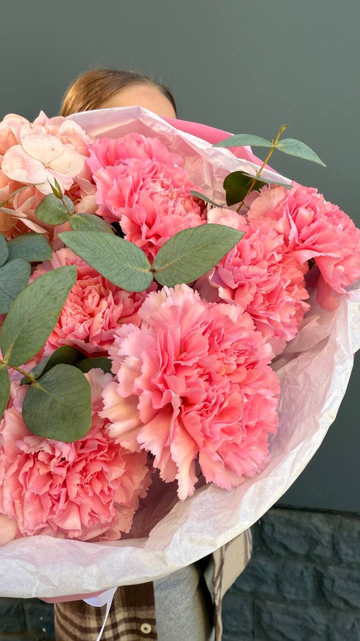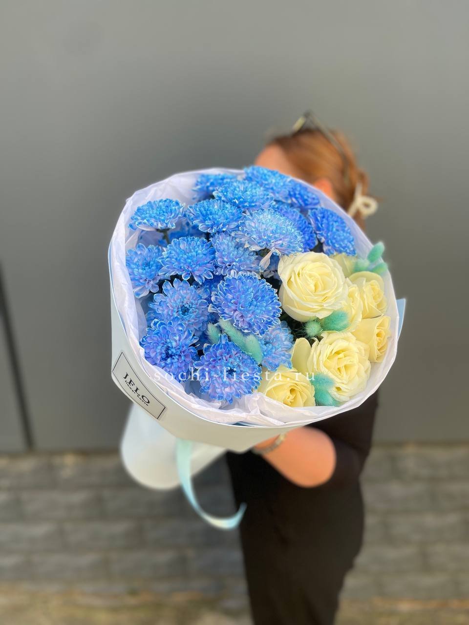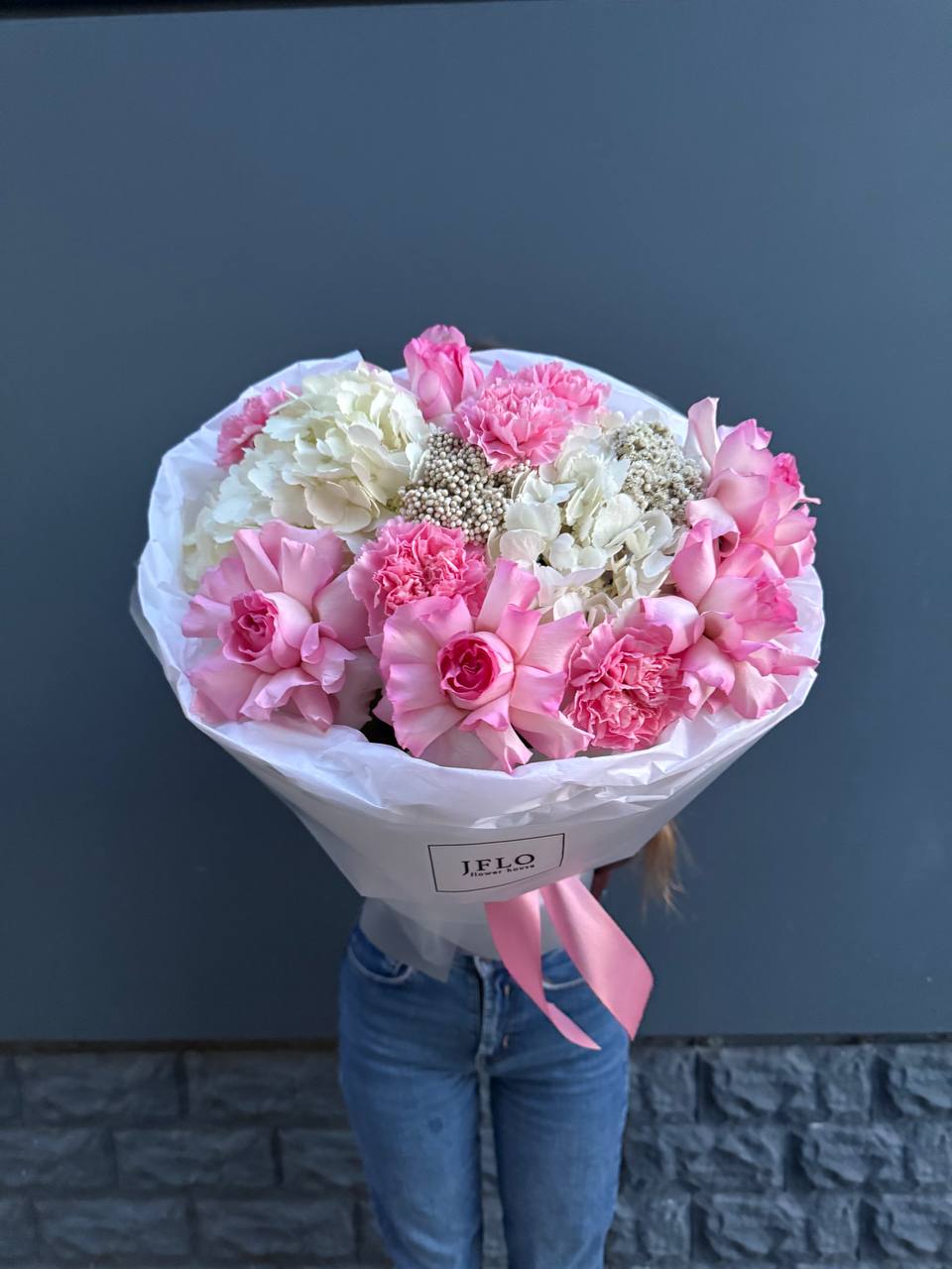 гортензия, хризантема, хамелациум, гербера, мисти баблс, диантус, пленка.