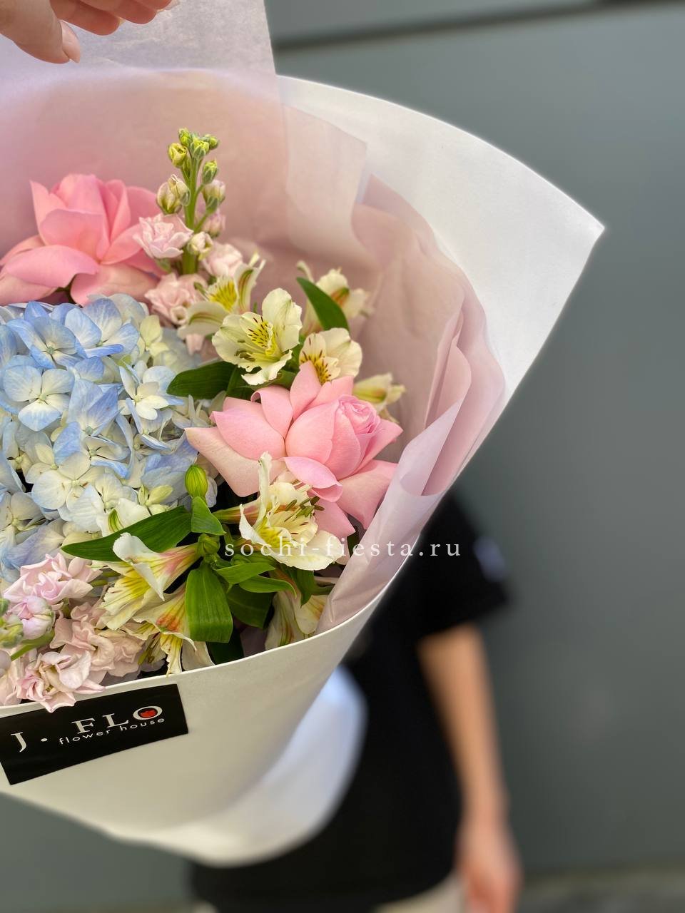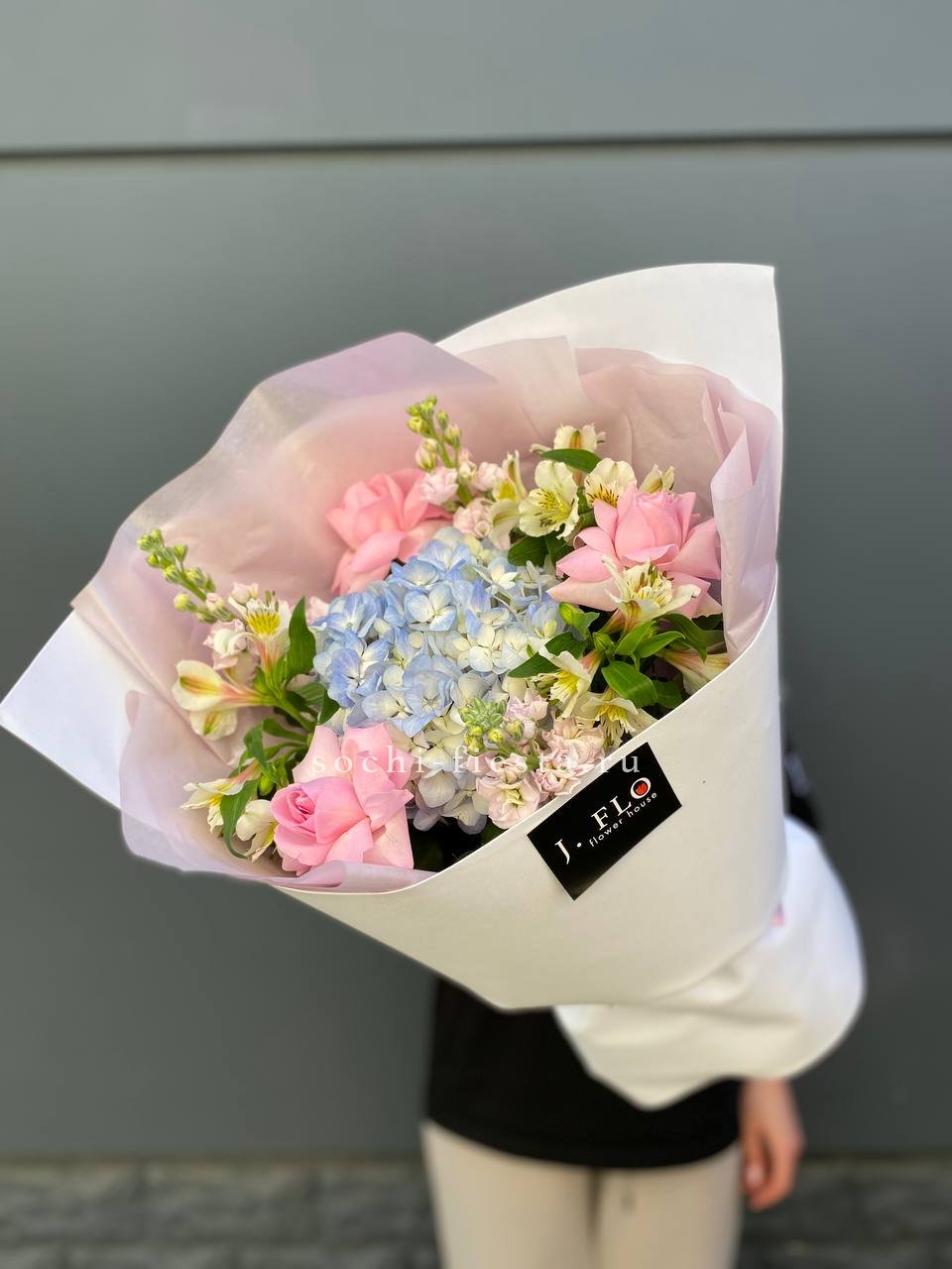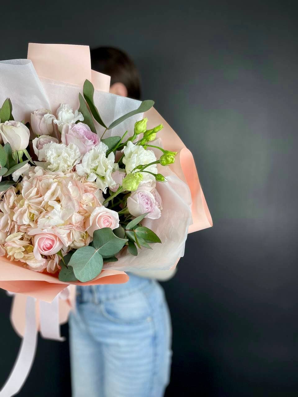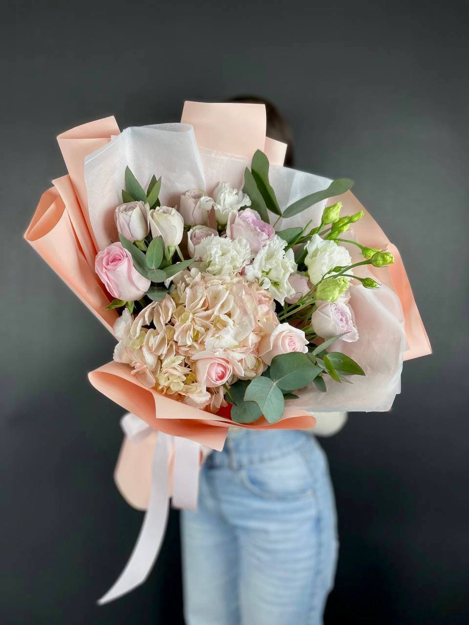 Белые розы и эустома образуют светлую основу, которую дополняют пионы и гортензия. Крафтовая упаковка удерживает форму, позволяя цветам раскрыться естественно и свободно.