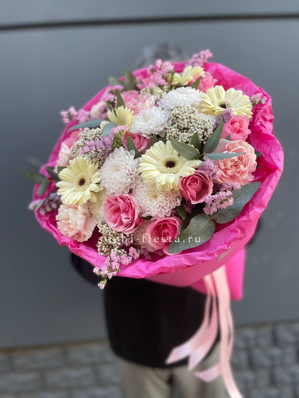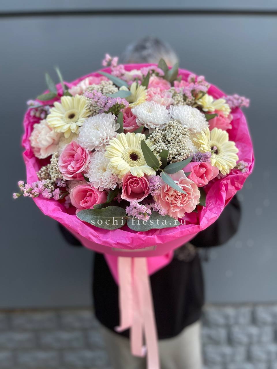 Пышный микс из гербер, хризантем и роз в обрамлении диантуса и статицы. Букет собран плотно, с яркими акцентами по всей форме. Озатамус и эвкалипт добавляют глубину и завершенность композиции.