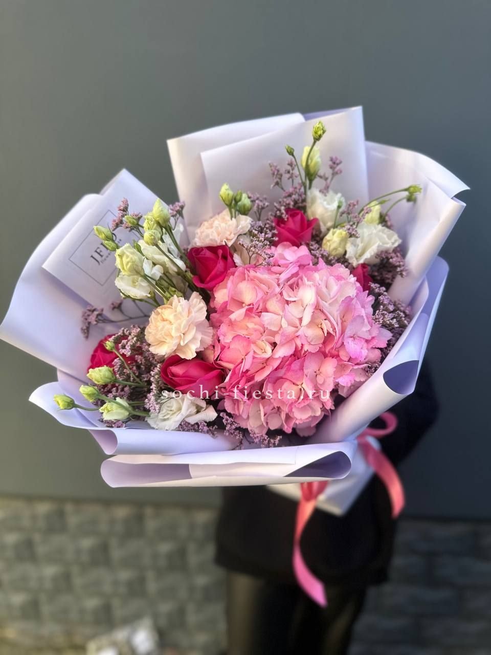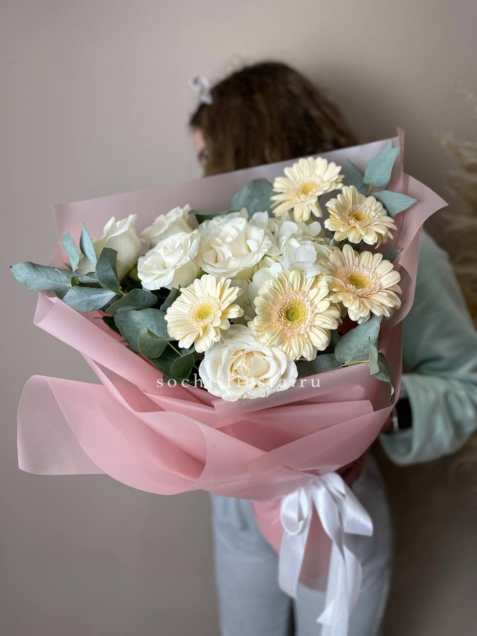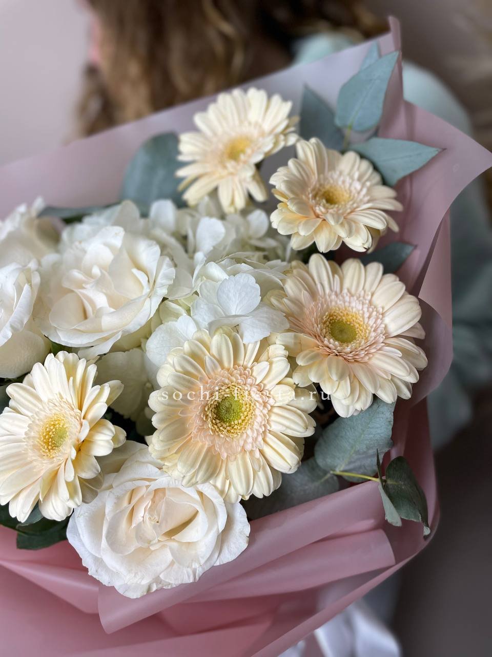 гортензия, гербера, роза, эвкалипт, оформление, лента.