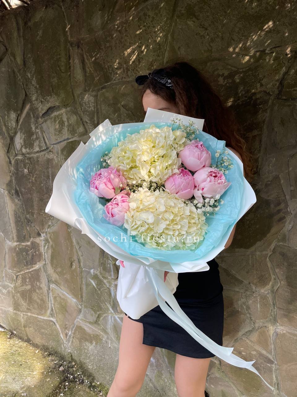 гортензия, розовые пионы Сара Бернар, гипсофила (аналог вне сезона по согласованию) лента, дизайнерская упаковка.