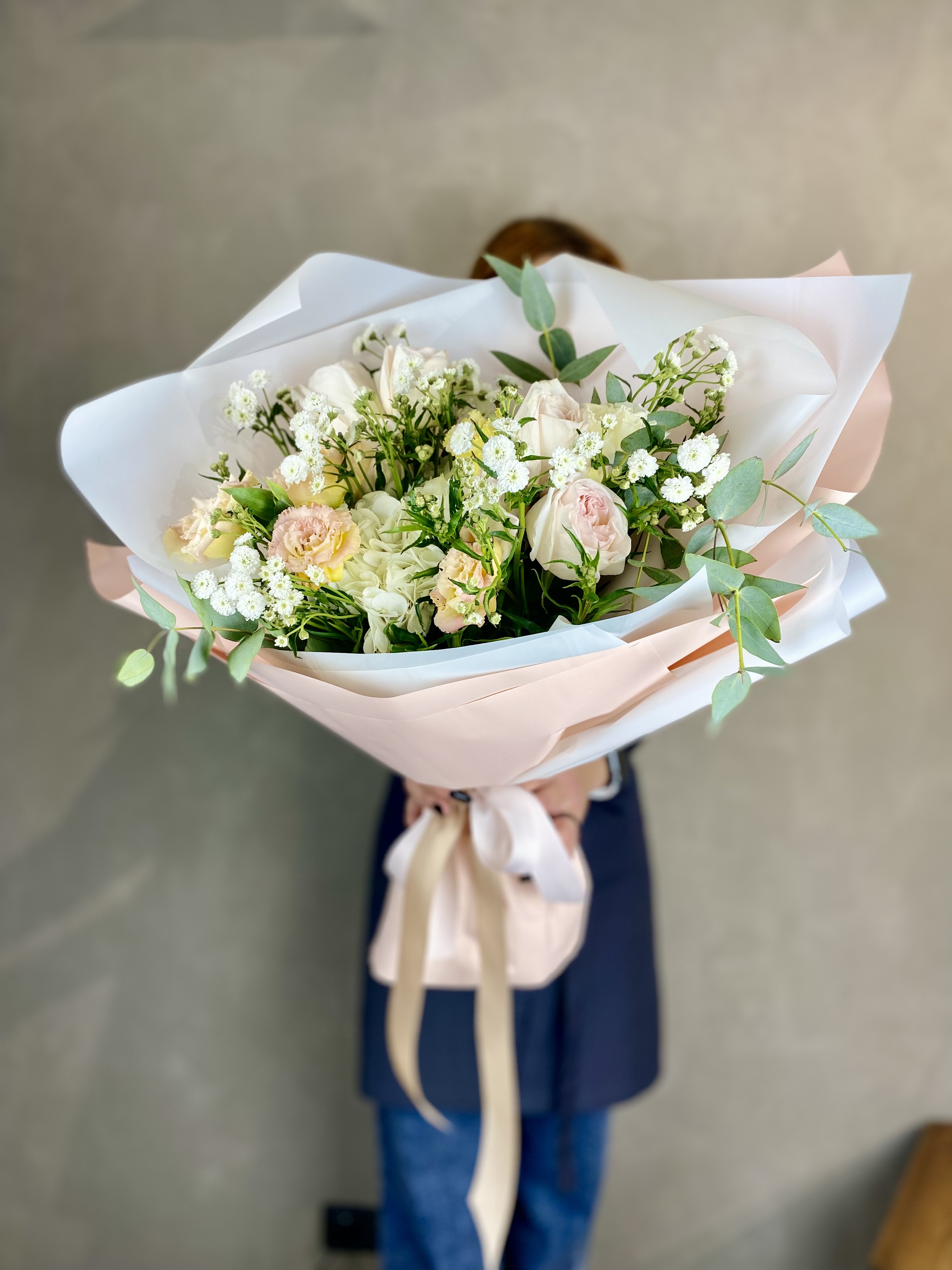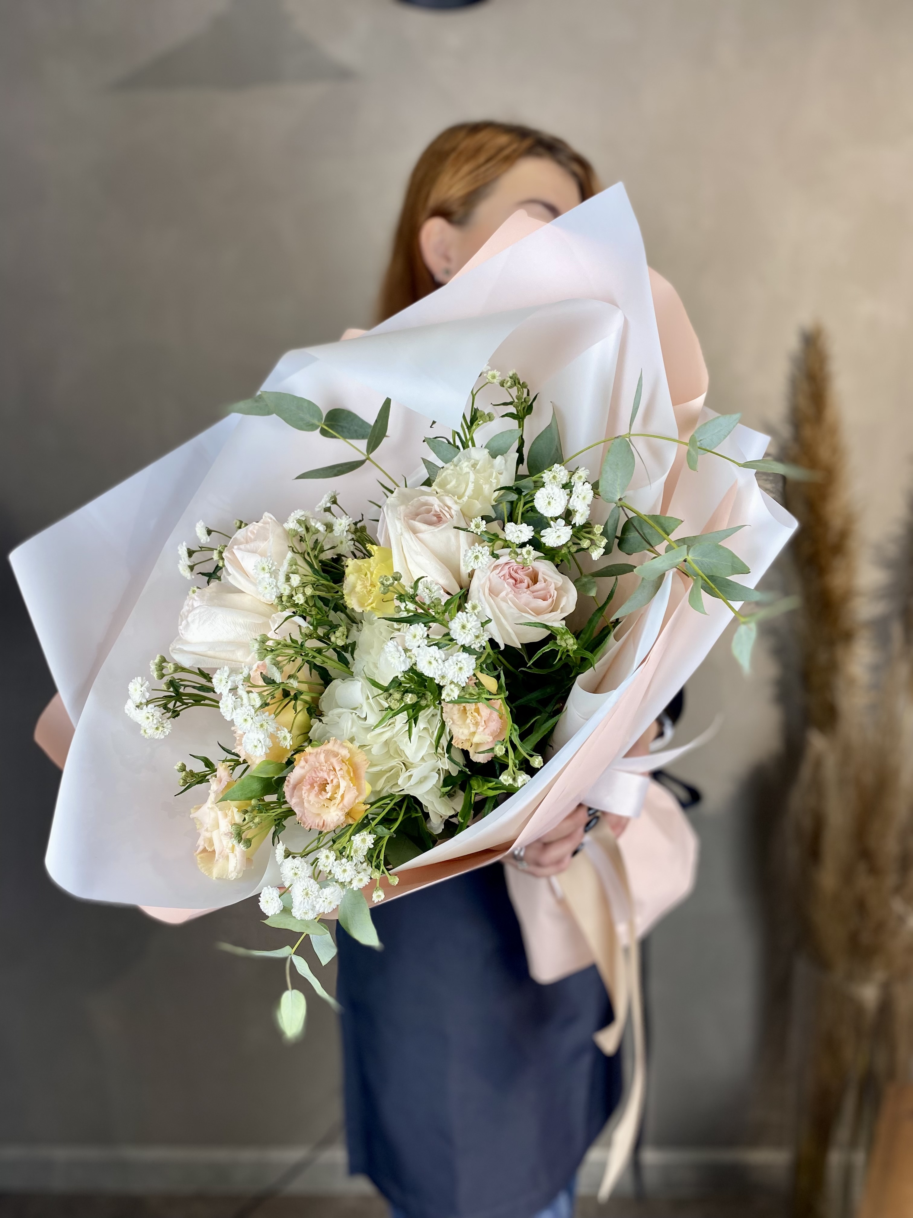 диантус, эустома, гортензия, хайди, эвкалипт, озатамус, пленка.