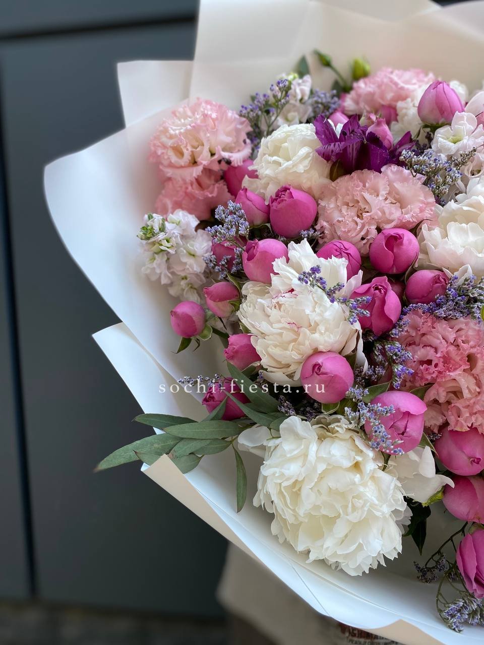 пионы (или аналог вне сезона), лимониум, маттиола, мисти баблс, эустома, эвкалипт, лента, упаковка.