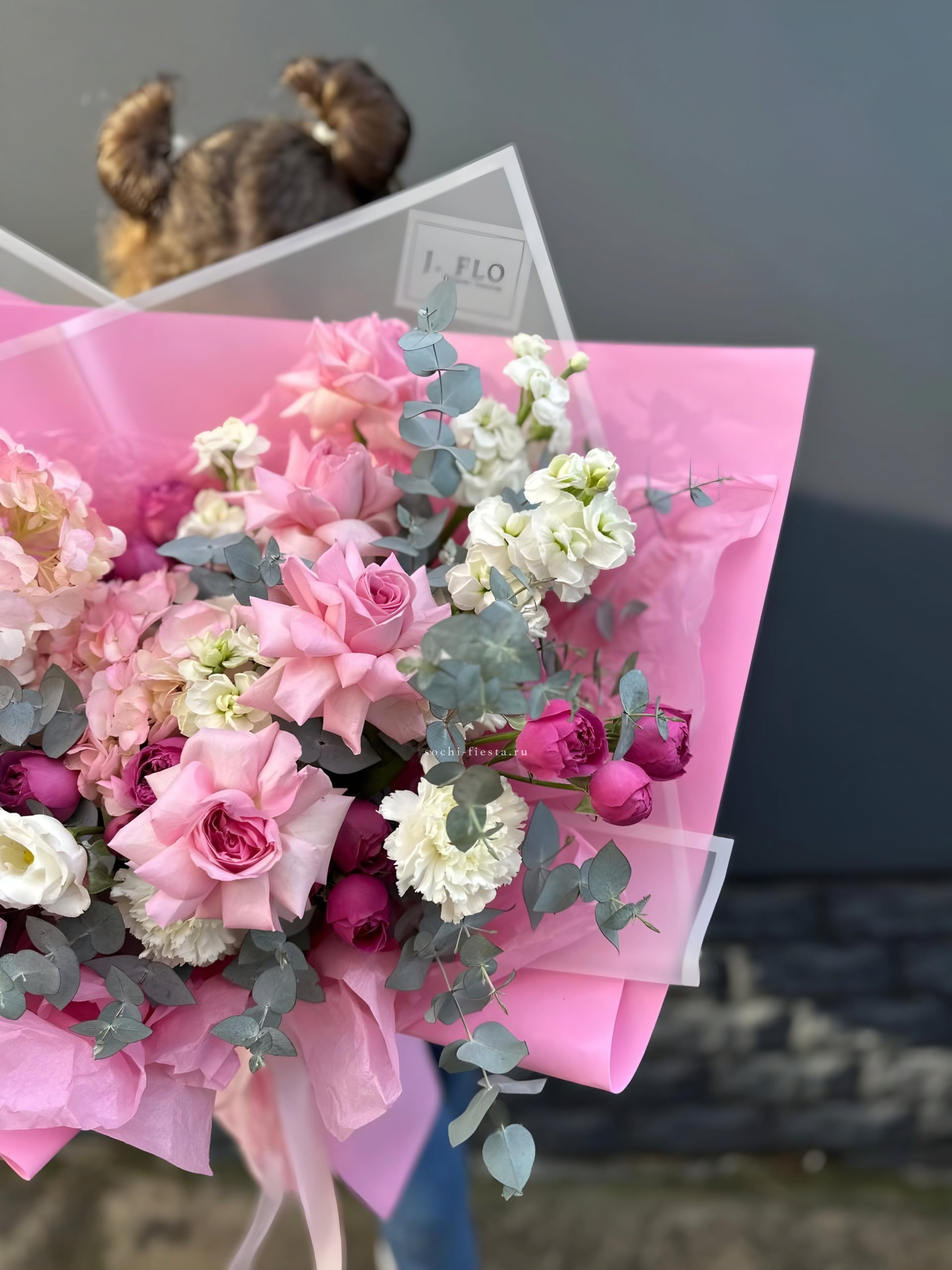 Диантусы и маттиола добавляют букету душистую лёгкость, а гортензия создаёт объёмную основу. Мисти баблс и эвкалипт рисуют воздушный контур вокруг розовых оттенков.