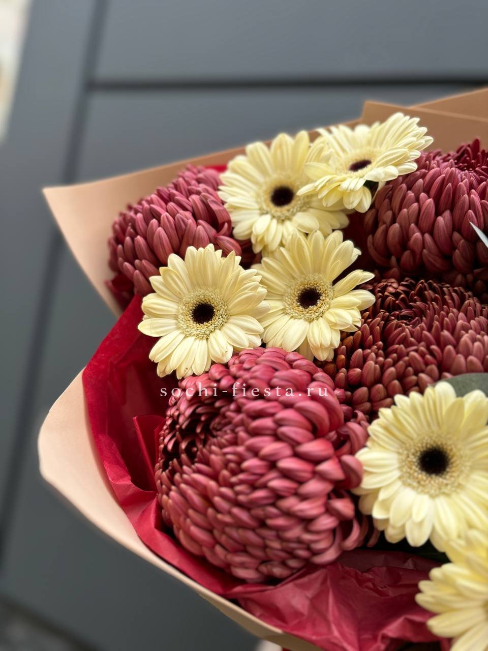 хризантемы Бигуди, герберы, эвкалипт, оформление.