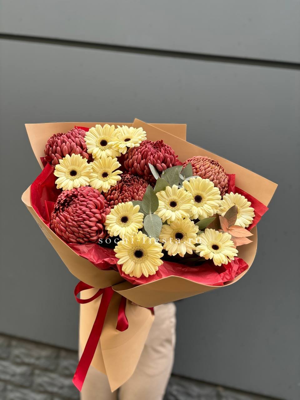 Солнечные герберы встречаются с кудрявыми хризантемами Бигуди в ярком жизнерадостном букете. Эвкалипт добавляет свежести и завершённости всей композиции.