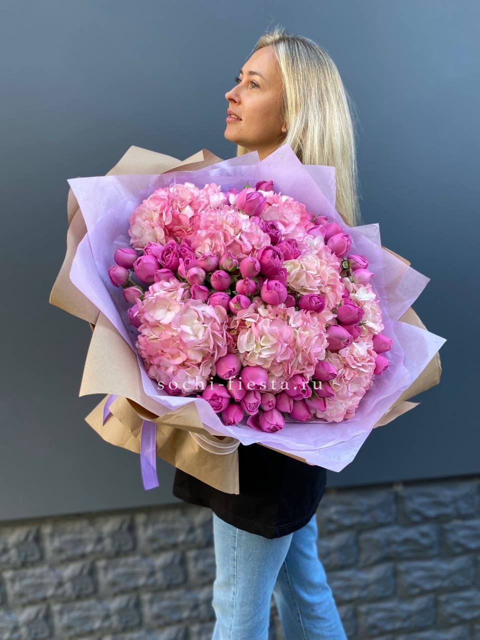 гортензия, пионовидная кустовая роза Мисти Баблс, лента, дизайнерская упаковка.