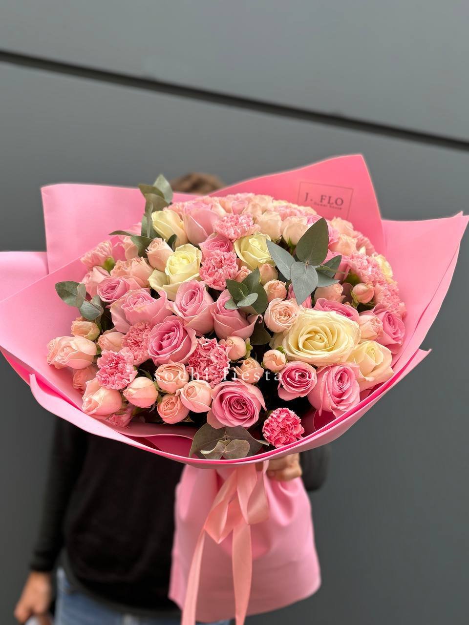 Крупные головки роз раскрываются широко, создавая объёмную фактуру с глубиной. Диантусы заполняют пространство между бутонами, формируя плотную структуру. Букет занимает много места и сразу привлекает внимание.