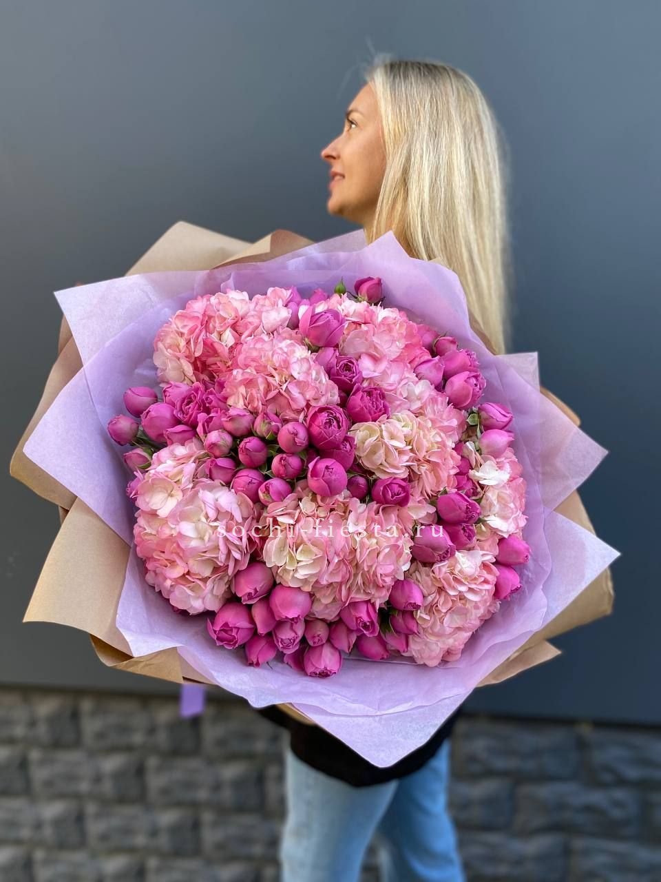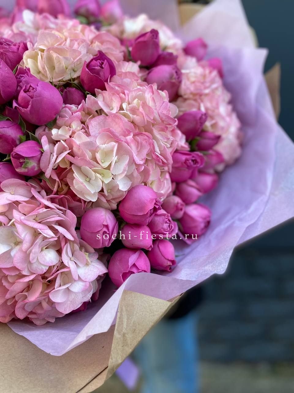 гортензия, гербера, диантус, эустома, свит ревиваль, кустовая роза, эвкалипт, лента, корейская пленка.
